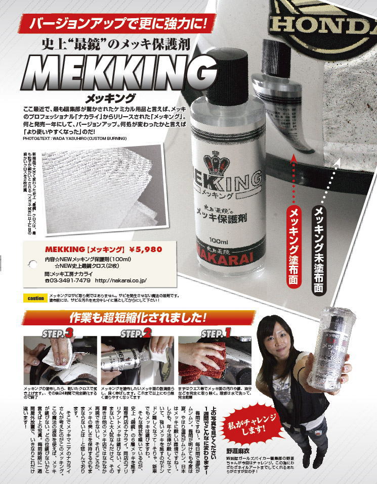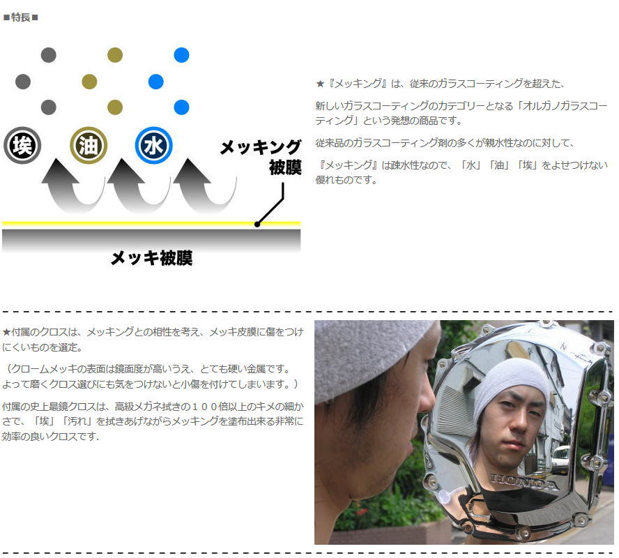 | We highly recommend MEKKING in order to maintain the luster of metal plating and also to make maintenance easy. |