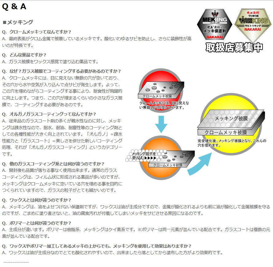 A. It is better to apply MEKKING even for the items that we have plated. Our plating is quite thick, so it doesn’t rust easily, but the thick layer is the base of the metal plating. The chrome plating on the top surface is very thin and also there are some invisible holes. Even ones that we have metal plated can get water spots. MEKKING can prevent those water spots. There could be seven layers of plating. (If you regularly apply MEKKING on the products that we have plated, you will never have to worry about rust. In fact, the displays we use at events are still sparkling since we apply MEKKING to the 10 year old plating on a regular basis.)