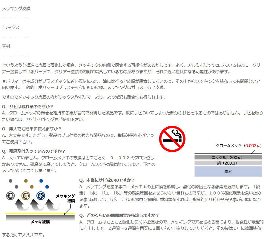 A. The product is invented to maintain the luster of chrome plating. It’s not for removing rust. Please use SABITORIKING for getting rid of rust.