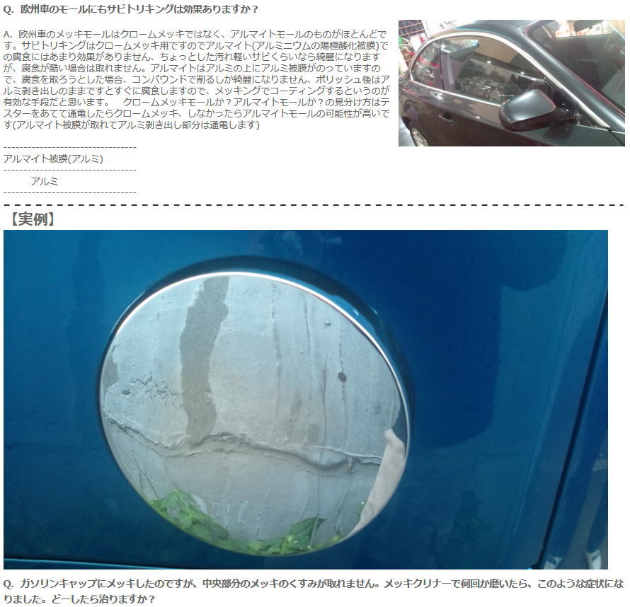 A. Metal plating of Europe made cars is mostly alumilite molding, not chrome. SABITORIKING is made for chrome plating. Therefore, it doesn’t work as well on corrosion on alumilite (anodal oxidation layer of aluminum). Little dirt or rust can be removed, but serious corrosion cannot be removed. Alumite has an aluminum layer on aluminum, so whittling away at corrosion with a compound is the only way to clean the surface. Bare aluminum can get corroded soon after polishing. An effective way to prevent damage. You can tell the difference between chrome moldings and alumite moldings by burn-in. If it turns on electricity, that is likely to be chrome plating. If not, it is likely to be alumilite molding (the bare aluminum can turn on electricity).