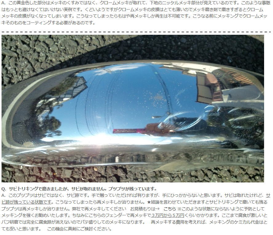 A. The spots are not rust, but rust marks. When you touch them, they are smooth. The rust has been removed, but the marks have stayed. The only way to fix it is re-plating. ★The bottom line is this, the spotty marks can only be fixed by replating. Please help us re-plate our items. To quote→ please click here. *We highly recommend MEKKING as prevention so that your items wouldn’t experience such situation. To replate a fender on a car it costs 30,000 to 50,000 yen for replating. Buffing cannot remove the corrosion marks completely, so they need to patty up. MEKKING is so much cheaper than replating. Please consider purchasing the product.