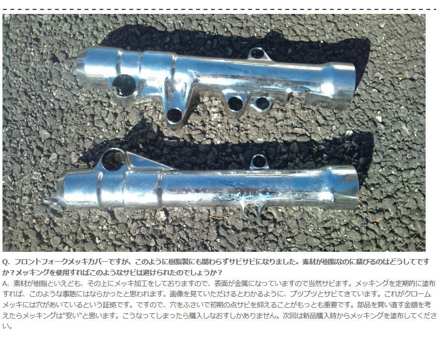 Q. Front fork metal plating covers get rusty in spite of its plastic material. Why does it get rust even through it’s made of plastic. Could I prevent this if I would have used MEKKING?