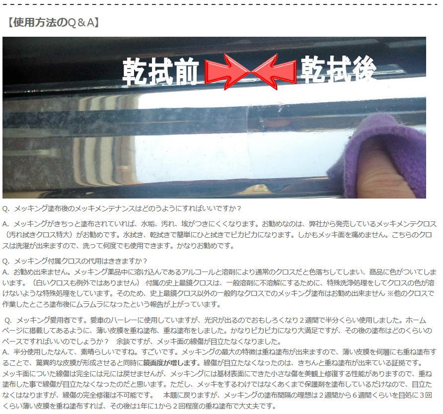Q. I’m happy with MEKKING. I’ve been using it on my Harley-Davidson. It’s great to see the glossy result. I’ve used up half of the product over two weeks. I applied it thinly several times. It’s nice and shiny now. How often should I apply it after the two weeks? By the way, thanks to the product, the line scratches on the plating have become inconspicuous.