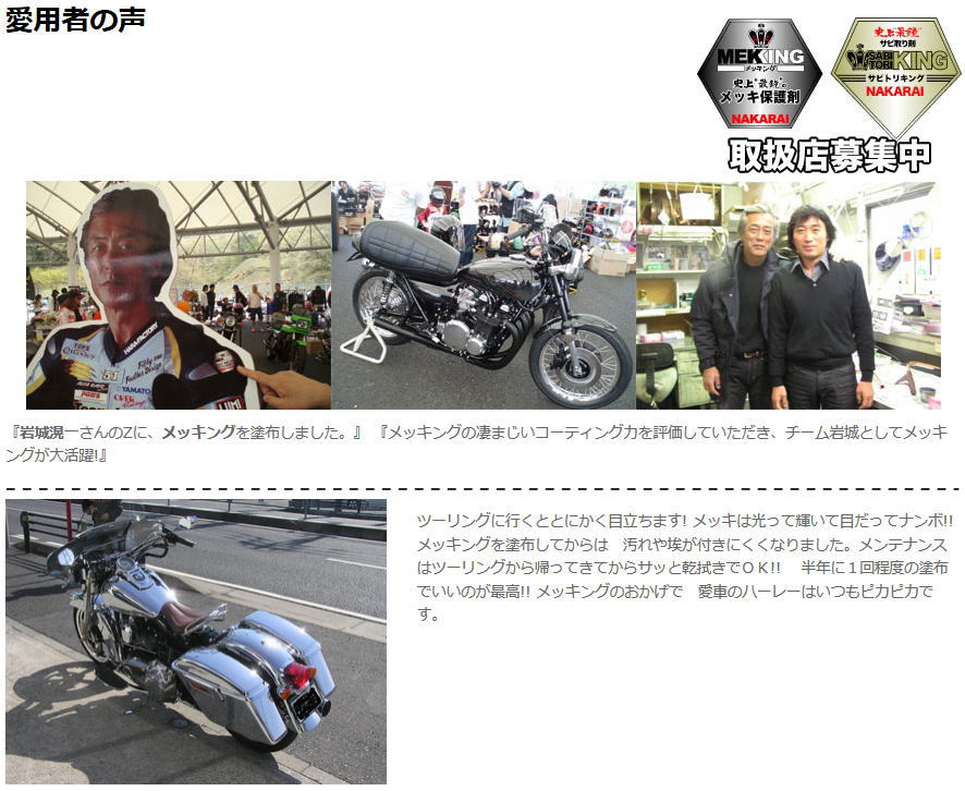 It seems like the metal plating loses its luster if you don’t provide proper maintenance. Aluminum plating especially tends to get spotty rust. But, it’s a hard work to scrub the surface with MEKKING, so I normally maintain the spark with Various coat from WAKOS and sometimes (for me once every three months) polish with MEKKING. That’s the way to maintain a deep sparkle for good. Also, MEKKING seems to work on glossy painted parts and iron parts. It protects the surface and also keeps their luster. People who are obsessed with sparkling vehicles should be happy with MEKKING. Mr. M. from Yokohama city