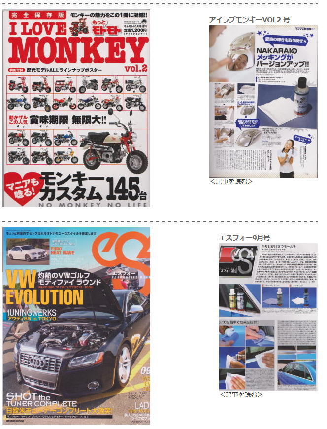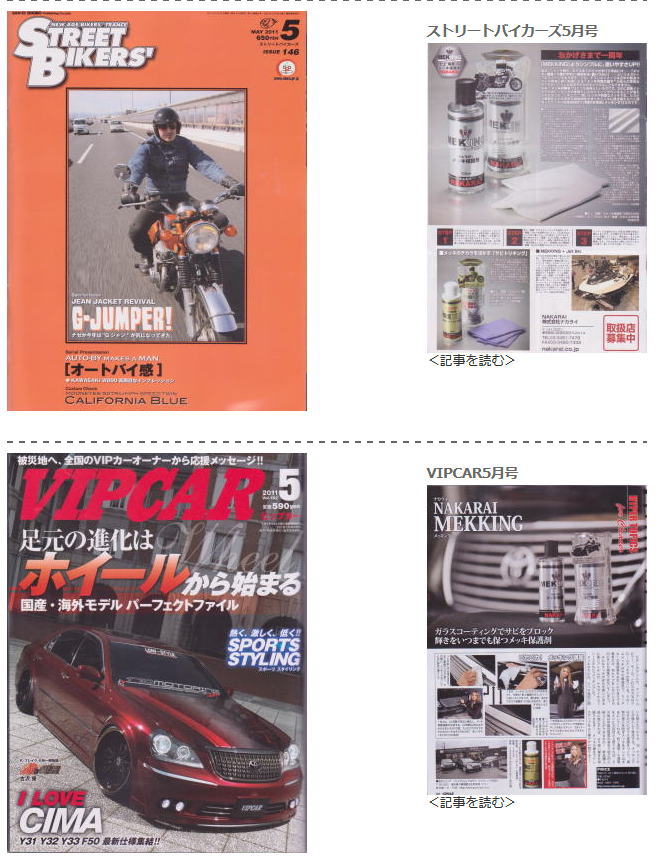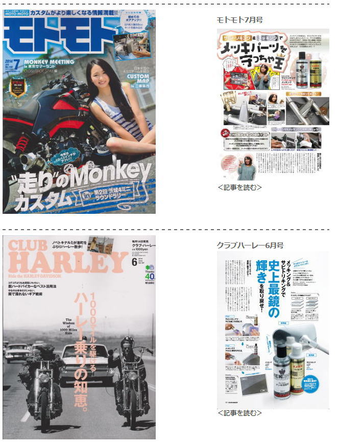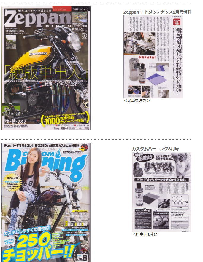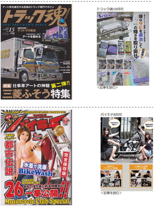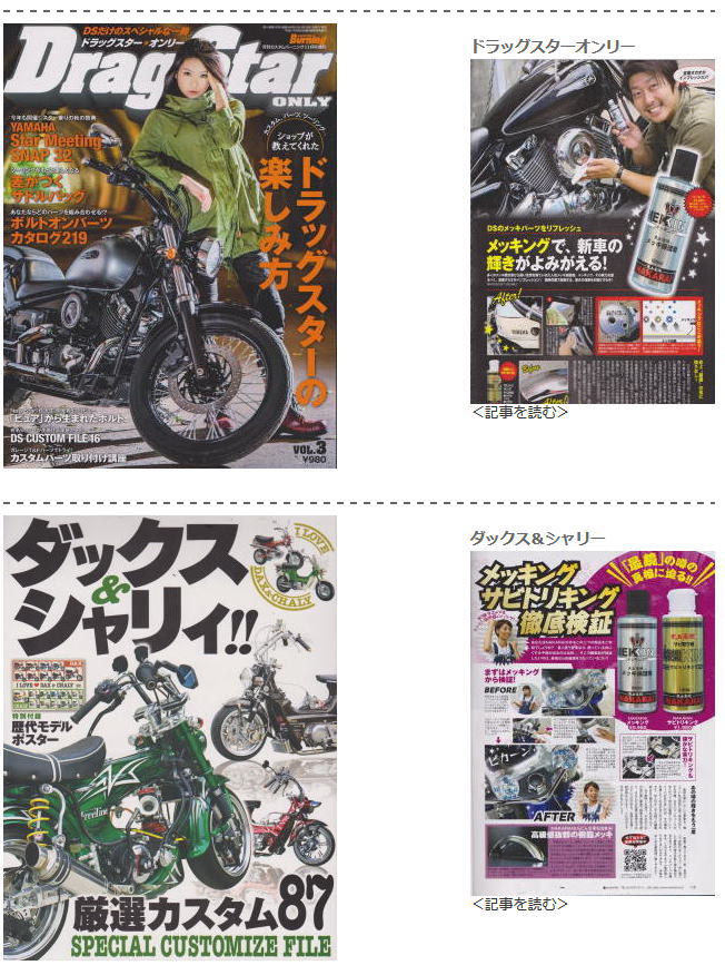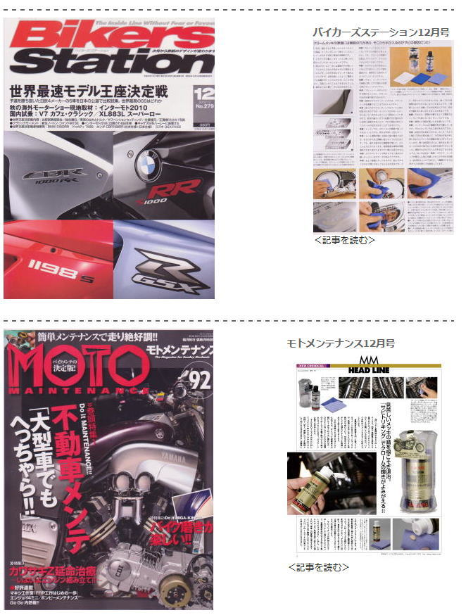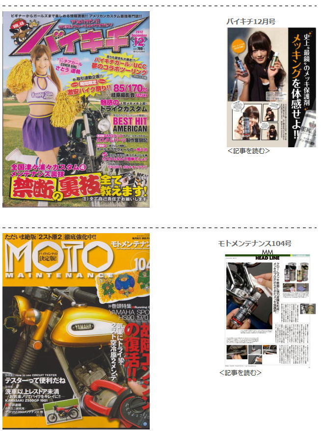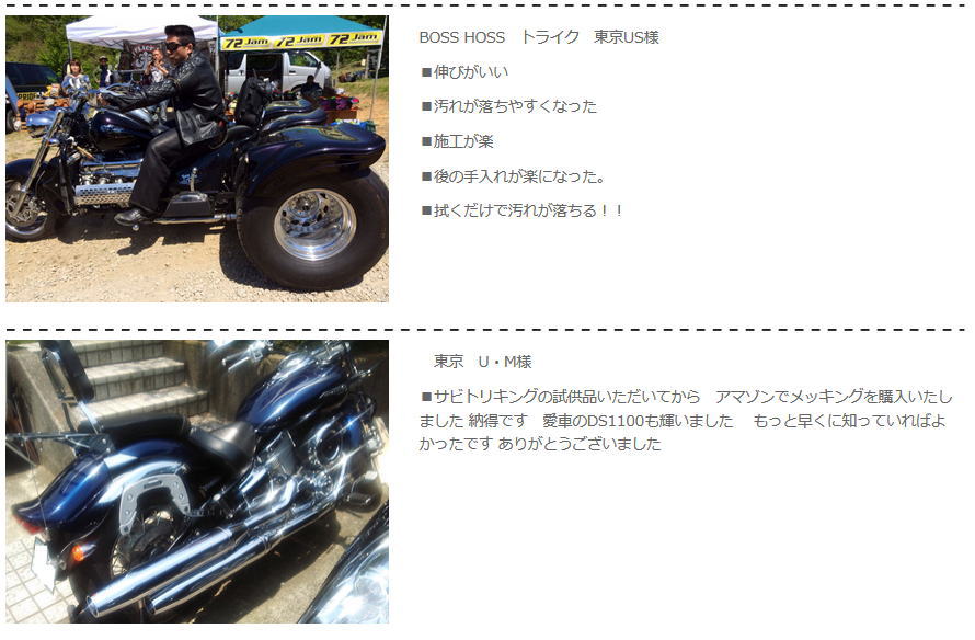 | It seems like the metal plating loses its luster if you don’t provide proper maintenance. Aluminum plating especially tends to get spotty rust. But, it’s a hard work to scrub the surface with MEKKING, so I normally maintain the spark with Various coat from WAKOS and sometimes (for me once every three months) polish with MEKKING. That’s the way to maintain a deep sparkle for good. Also, MEKKING seems to work on glossy painted parts and iron parts. It protects the surface and also keeps their luster. People who are obsessed with sparkling vehicles should be happy with MEKKING. Mr. M. from Yokohama city |