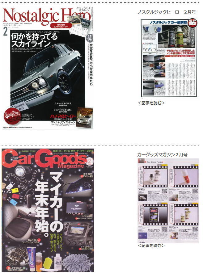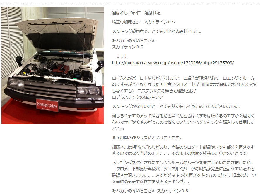 | We had the chance to talk to a happy user at the Nostalgic 2 day event. “The rust has been bothering me since the parking lot for my car is only 1.5 meter away from the sea. The car gets so much sea water that the bumper gets cloudy. I hadn’t found anything that could remove the rust, but SABITORIKING got rid of the rust and MEKKING prevents spotty rust. The car doesn’t get dirty easily. It shines by wiping with a wet cloth. The product can be applied to plastic plating and needs application of the product only once every three months. I’ve been raving about the products to my car loving friends.” |