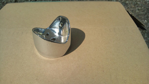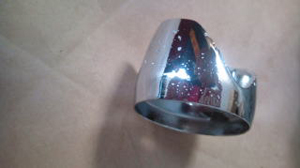 外装パーツには、蒸着メッキはあまり向きません。まして一品ものとなると、、新たに部品を購入して頂き、クロームメッキしました。 見て頂いてもわかるようにメッキ風?塗装は白いぽい仕上がりで、青みのある光沢がありません。クロームメッキというよりアルミポリッシュに近い質感です。(他社でメッキ風塗装をされたパーツを弊社でメッキに変更は不可)